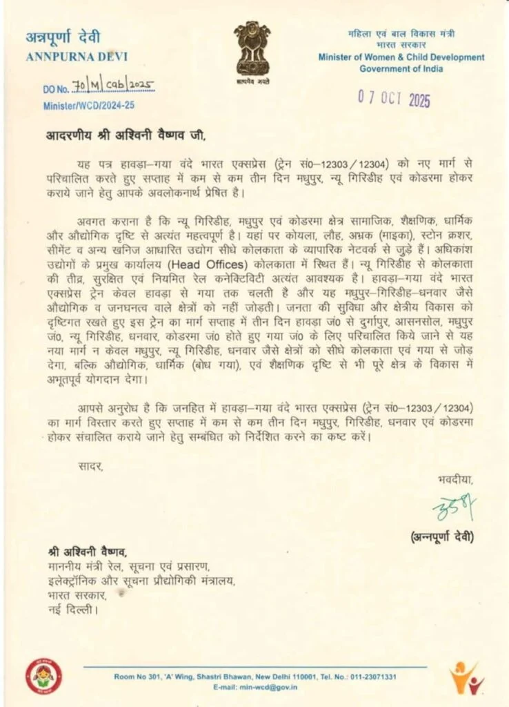 केन्द्रीय मंत्री अन्नपूर्णा देवी ने हावड़ा-गया वंदे भारत एक्सप्रेस के नए मार्ग विस्तार के लिए रेल मंत्री के समख रखी मांग