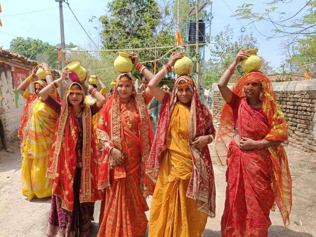 4 किलोमीटर दूर जयंती नदी घाट से जल भरकर लौटीं माताएं-बहनें, पूरा इलाका हुआ भक्तिमय। वृंदावन के कथावाचक मुकुल कृष्ण जी महाराज करेंगे संगीतमय कथा का वाचन।