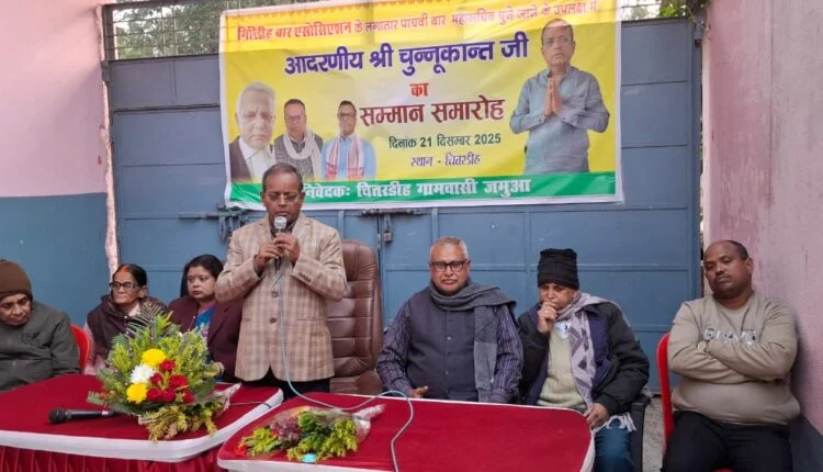 गिरिडीह। गिरिडीह जिला अधिवक्ता संघ बार के चुनाव में लगातार पांचवीं बार ऐतिहासिक जीत दर्ज करने वाले वरिष्ठ अधिवक्ता चुन्नू कांत के सम्मान में उनके पैतृक गांव जमुआ प्रखंड के चित्तरडीह में रविवार को भव्य सम्मान समारोह का आयोजन किया गया। समारोह में गांव के गणमान्य लोगों, स्थानीय अधिवक्ता व सामाजिक कार्यकर्ताओ ने महासचिव चुन्नू कांत को फूल माला पहनाकर और शॉल ओढ़ाकर सम्मानित किया। इस दौरान ग्रामीणों ने चुन्नूकांत की जीत को पूरे क्षेत्र के लिए गर्व का क्षण बताया। वक्ताओं ने कहा कि चुन्नू कांत जी की यह जीत उनकी ईमानदारी, कर्तव्यनिष्ठा और अधिवक्ताओं के हित में किए गए कार्यों का परिणाम है। उन्होंने हमेशा बार एसोसिएशन को मजबूती देने और न्यायिक व्यवस्था को सुदृढ़ बनाने के लिए कार्य किया है।सम्मान समारोह को संबोधित करते हुए महासचिव चुन्नू कांत ने सभी मतदाताओं, अधिवक्ता साथियों एवं ग्रामीणों का आभार व्यक्त करते हुए कहा कि यह जीत केवल उनकी नहीं, बल्कि पूरे अधिवक्ता समुदाय और गांववासियों की जीत है। आगे भी वे अधिवक्ताओं के अधिकारों और न्याय व्यवस्था के लिए पूरी निष्ठा से कार्य करते रहेंगे।
