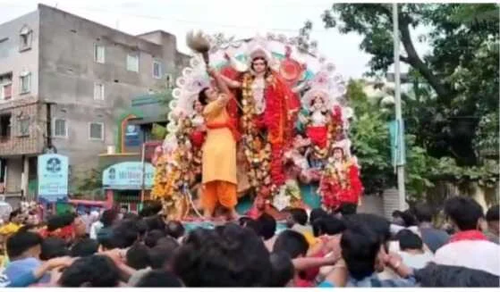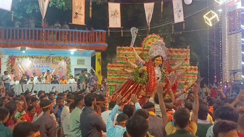 मां की प्रतिमा को कांधे पर लेने के लिए व्याकुल दिखी भक़्तों की भीड़