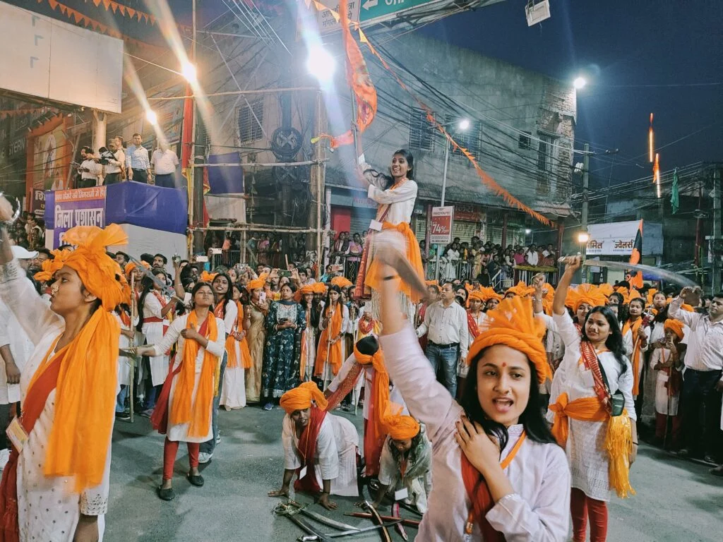 वहीं जय श्री राम के जयकारे से पूरा शहर गुंजायमान हो गया। अहले सुबह से ही विभिन्न मोहल्लों में रामभक्तो की भीड़ लाठी और तलवार समेत अन्य अस्त्र शस्त्र के साथ अखाड़े के रूप में निकले। आरएसएस की कुटुंब प्रबोधन की संचालिका सह समाजसेविका पूनम बरनवाल और मिन्नी बरनवाल के नेतृत्व में करीब तीन सौ युवतिया भगवा पगड़ी पहनकर अस्त्र शस्त्र का प्रदर्शन करती नजर आई।