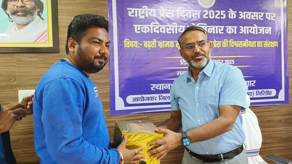 गिरिडीह। राष्ट्रीय प्रेस दिवस के मौके पर रविवार को समाहरणालय सभागार जिला प्रशासन के द्वारा “बढ़ती भ्रामक सूचनाओं के बीच प्रेस की विश्वसनीयता का संरक्षण” विषय पर सेमिनार का आयोजन किया गया। उपायुक्त रामनिवास यादव की अध्यक्षता में आयोजित सेमिनार में जिले के सभी प्रिंट व इलेक्ट्रॉनिक मीडिया के ब्यूरो चीफ के अलावा अन्य पत्रकारगण शामिल हुए। कार्यक्रम की शुरुआत जिला जनसंपर्क पदाधिकारी अंजना भारती के द्वारा स्वागत भाषण से की गई। इस दौरान उपायुक्त श्री यादव ने सभी पत्रकारों को राष्ट्रीय प्रेस दिवस की शुभकामनाएं देते हुए सम्मानित किया ।