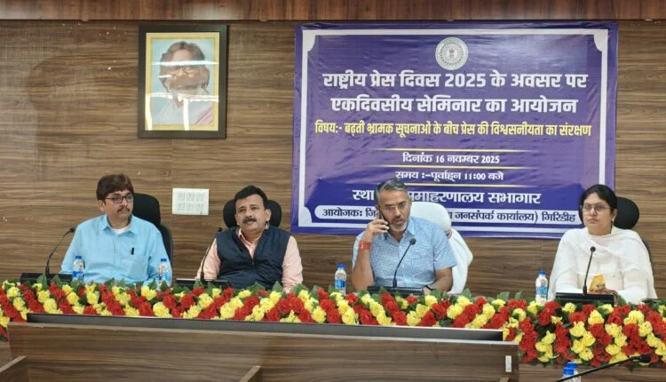 गिरिडीह। राष्ट्रीय प्रेस दिवस के मौके पर रविवार को समाहरणालय सभागार जिला प्रशासन के द्वारा “बढ़ती भ्रामक सूचनाओं के बीच प्रेस की विश्वसनीयता का संरक्षण” विषय पर सेमिनार का आयोजन किया गया। उपायुक्त रामनिवास यादव की अध्यक्षता में आयोजित सेमिनार में जिले के सभी प्रिंट व इलेक्ट्रॉनिक मीडिया के ब्यूरो चीफ के अलावा अन्य पत्रकारगण शामिल हुए। कार्यक्रम की शुरुआत जिला जनसंपर्क पदाधिकारी अंजना भारती के द्वारा स्वागत भाषण से की गई। इस दौरान उपायुक्त श्री यादव ने सभी पत्रकारों को राष्ट्रीय प्रेस दिवस की शुभकामनाएं देते हुए सम्मानित किया ।