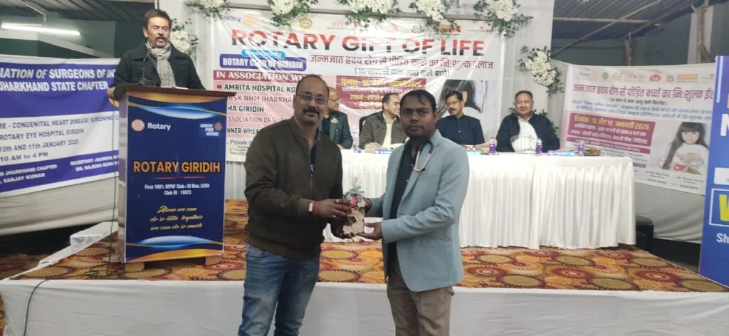 गिरिडीह। रोटरी गिरिडीह द्वारा, अमृता हॉस्पिटल कोच्चि, राष्ट्रीय स्वास्थ्य मिशन झारखंड, आईएमए गिरिडीह, एसोसिएशन सर्जन ऑफ इंडिया, इनर व्हील क्लब ऑफ गिरिडीह सनशाइन के सहयोग से रोटरी गिफ्ट ऑफ लाइफ के तहत जन्मजात हृदय रोग से पीड़ित बच्चों के निःशुल्क के ईलाज के लिए दो दिवसीय मेगा स्क्रीनिंग कैंप का आयोजन किया गया। रोटरी नेत्र चिकित्सालय में आयोजित कैंप का उद्घाटन समारोह में मुख्य अतिथि के रूप में राष्ट्रीय स्वास्थ्य मिशन झारखंड के निदेशक शशि प्रकाश झा, विशिष्ट अतिथि सिविल सर्जन डॉ शेख मो० जफरुल्लाह ने संयुक्त रूप से किया