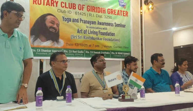 गिरिडीह। रोटरी क्लब ऑफ गिरिडीह ग्रेटर एवं श्री श्री रविशंकर फाउंडेशन की संस्था आर्ट ऑफ लिविंग के संयुक्त तत्वाधान में इंडिया लिटरेसी मिशन के तहत सोमवार को योग और प्राणायाम जागरूकता शिविर का आयोजन किया गया। शिविर में आर्ट ऑफ लिविंग के शिक्षक योग और प्राणायाम के बारे में और उनसे होने वाले शारीरिक और मानसिक लाभ के बाबत विस्तार से जानकारी दी।