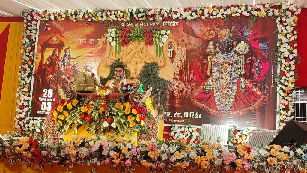 गिरिडीह। शहर के आई सी आर रोड स्थित श्री श्याम मंदिर के प्रांगण में श्री श्याम भक्त मंडल द्वारा आयोजित सात दिवसीय श्रीमद भागवत कथा महोत्सव की शुरुआत रविवार को भव्य कलश यात्रा के साथ हुई। जिसमें काफी संख्या में भक्त महिलाएं शामिल हुई। इस मौके पर अनुष्ठान के मुख्य यजमान श्री श्याम भक्त मंडल के अध्यक्ष बाँके बिहारी शर्मा और उनकी धर्मपत्नी सिर पर श्रीमद भागवत ग्रंथ लेकर आगे आगे चल रहे थे। वहीं अन्य भक्त महिलाएं सिर पर कलश लेकर चल रही थी। बाजे गाजे के साथ निकली कलश यात्रा शहर भ्रमण करते हुए वापस श्री श्याम मंदिर पहुंच कर समाप्त हुई। इस दौरान भक्तों द्वारा लगाए जा रहे जयकारे से पूरा माहौल भक्तिमय हो गया था। इधर श्री श्याम मंदिर पहुंचने पर राजस्थान के जयपुर से आए प्रसिद्ध कथावाचक राधेश गौतम द्वारा बाँके बिहारी शर्मा से श्रीमद कथा ग्रंथ लेकर दरबार में सजाया गया।विदित हो कि श्री श्याम भक्त मंडल द्वारा आयोजित सात दिवसीय श्री श्रीमद भागवत कथा महोत्सव को लेकर जहाँ एक और श्री श्याम मंदिर प्रांगण में भव्य दरबार सजाया गया है। वहीं राजस्थान से आए प्रसिद्ध श्री मद भागवत कथा वाचक राधेश गौतम जी के द्वारा अगले सात दिनो तक शहर में भक्ति की बयार बहेगी।इधर कलश यात्रा में मुकेश जालान, संजय भुदोलिया, राकेश मोदी, कुणाल मोदी, राहुल जलान, कृष्ण अग्रवाल, सोनू शर्मा, संजय शर्मा सहित समिति के अन्य सदस्यों के अलावे काफी संख्या में भक्त शामिल थे।
