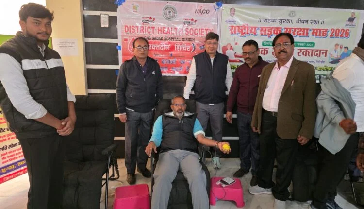 गिरिडीह। सड़क सुरक्षा अभियान के तहत शनिवार को समाहरणालय प्रांगण में सड़क सुरक्षा समिति और स्वास्थ्य विभाग के संयुक्त तत्वाधान में रक्तदान शिविर का आयोजन किया गया। शिविर का मुख्य उद्देश्य लोगों को सड़क सुरक्षा और यातायात नियम, हेलमेट का उपयोग, ड्राइविंग लाइसेंस आदि के संबंध में जागरूक करना था ।शिविर में कुल 105 यूनिट रक्त संग्रह किया गया। वहीं प्रशासन ने रक्तदान करने वाले सभी रक्तवीरो को उपहार के रूप में हेलमेट प्रदान किया गया।इस दौरान उपायुक्त रामनिवास यादव ने स्वयं रक्तदान कर रक्तदाताओं को प्रोत्साहित किया। वहीं शिविर में विभिन्न विभागों के अधिकारियों, पुलिस अधिकारियों, समाज सेवी संस्थाओं व युवाओं के द्वारा रक्तदान किया गया तथा सड़क सुरक्षा, यातायात नियमों का उचित अनुपालन, हेलमेट, सीटबेल्ट का उपयोग करने हेतु प्रोत्साहित किया गया।                शिविर को संबोधित करते हुए उपायुक्त श्री यादव ने कहा कि रक्तदान महादान है, इससे हम किसी का जीवन बचा सकते हैं। हर स्वस्थ व्यक्ति को प्रत्येक तीन माह में रक्तदान करना चाहिए। कहा कि दुर्घटना की वजह से घायल या बीमारी की वजह से रक्त की कमी से जूझ रहे व्यक्ति को, रक्त मिलने से उस व्यक्ति का जीवन बच पाता है।